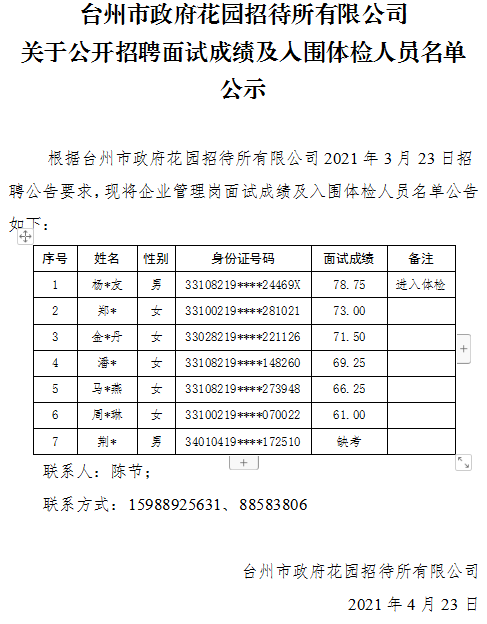 臺州市政府花園招待所有限公司關(guān)于公開招聘面試成績及入圍體檢人員名單公示