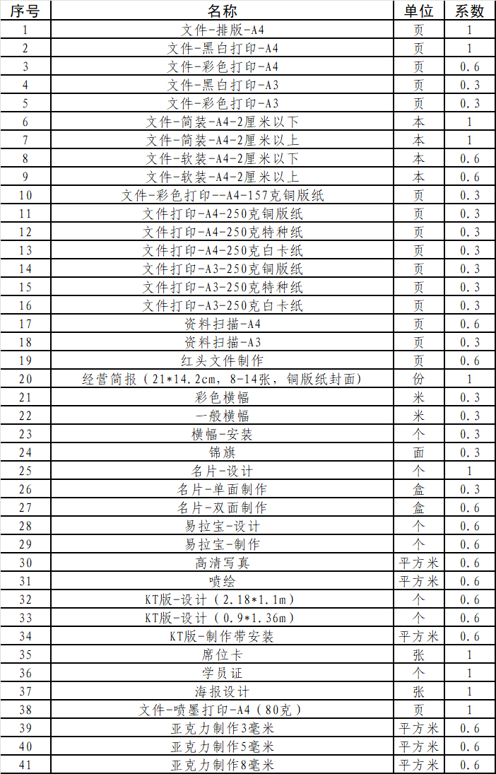 1.采購內(nèi)容:選擇一家文印服務(wù)商簽訂服務(wù)協(xié)議,原則上服務(wù)期限不超過2年,每年續(xù)簽一次,若出現(xiàn)服務(wù)不到位的情況,公司有權(quán)重新采購或終止服務(wù)。文印服務(wù)包括但不限于下列清單。