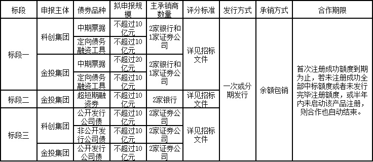 發(fā)行債券主體為科創(chuàng)集團(tuán)和金投集團(tuán)。共分為三個(gè)標(biāo)段,通過公開招投標(biāo)形式評(píng)選承銷商,總共采購(gòu)6家銀行,6-8家證券公司,標(biāo)段一共計(jì)采購(gòu)4家銀行和2家證券公司,標(biāo)段二共計(jì)采購(gòu)2家銀行,標(biāo)段三共計(jì)采購(gòu)6家證券公司,具體見下表: